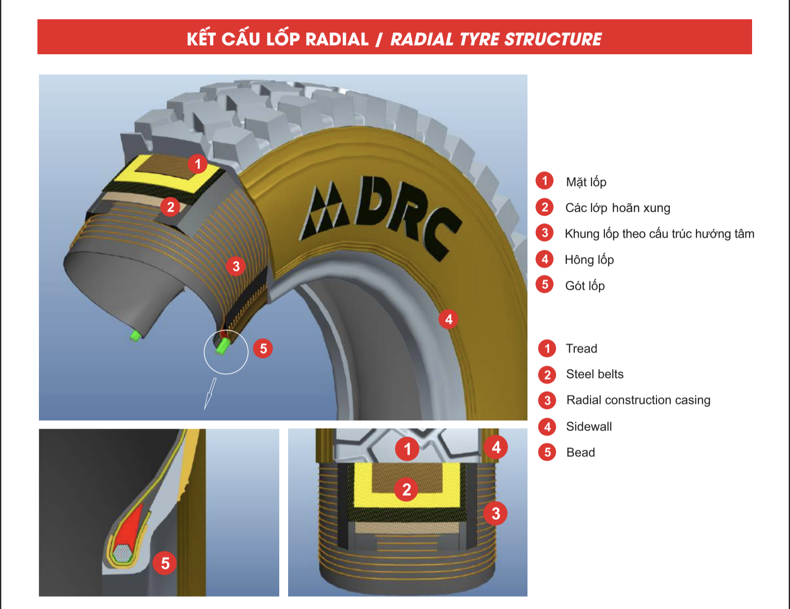 Khác với lốp BIAS hay còn gọi là lốp mành vải. Lốp Radial được cấu tạo bởi các sợ mành thép, giúp lốp chịu được va đập, linh hoạt hơn khi di chuyển. Lốp còn cải tiến về chất liệu để ít sinh nhiệt và mài mòn hơn loại lốp mành vải.